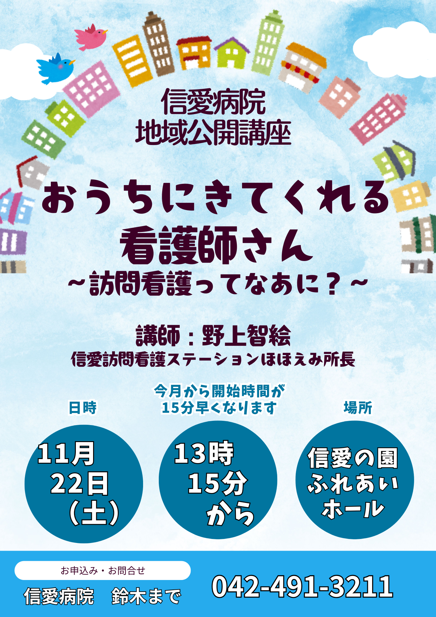 2025/10/30 病院からのお知らせ イベント 11月22日(土)信愛病院公開講座 開催のお知らせ 日時:2025年11月22日(土)13時15分~ 場所:信愛の園 ふれあいホールテーマ:「おうちにきてくれる看護師さん~訪問看護ってなあに~?」講師: 野上智絵(信愛訪問看護ステーションほほえみ 所長) 一覧へ戻る